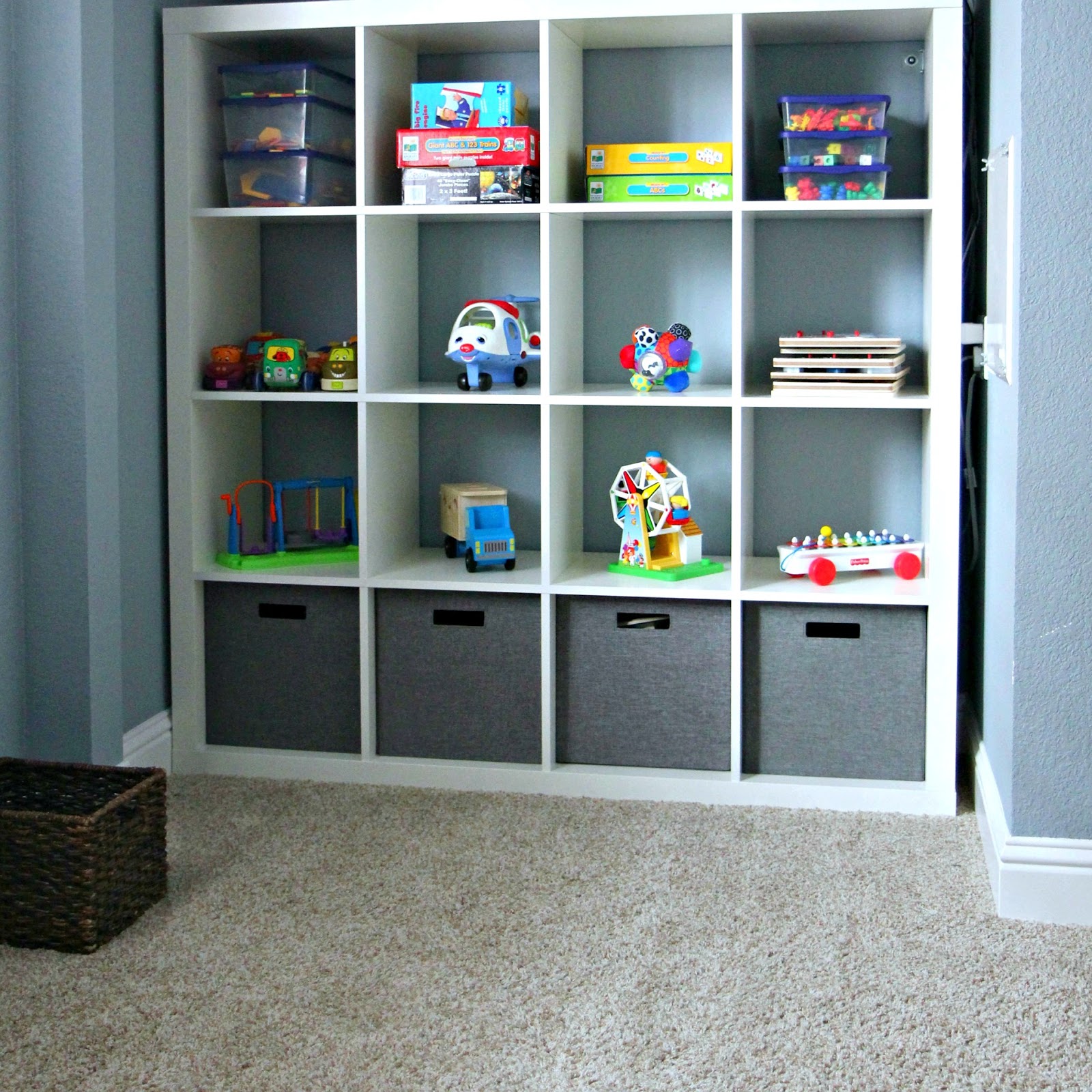 Our playroom/ nursery contains a wall storage system, small couch, portable crib, and some toys and toy baskets. We had a large baby crib, but after three kids, it was destroyed. A friend gave us this amazing portable crib/play yard as a shower gift and it is so cozy! Our daughter sleeps in it each night and we can move it to different rooms for naps depending on what my older kids are up to. I love the flexibility of not having a large bulky crib in our home.