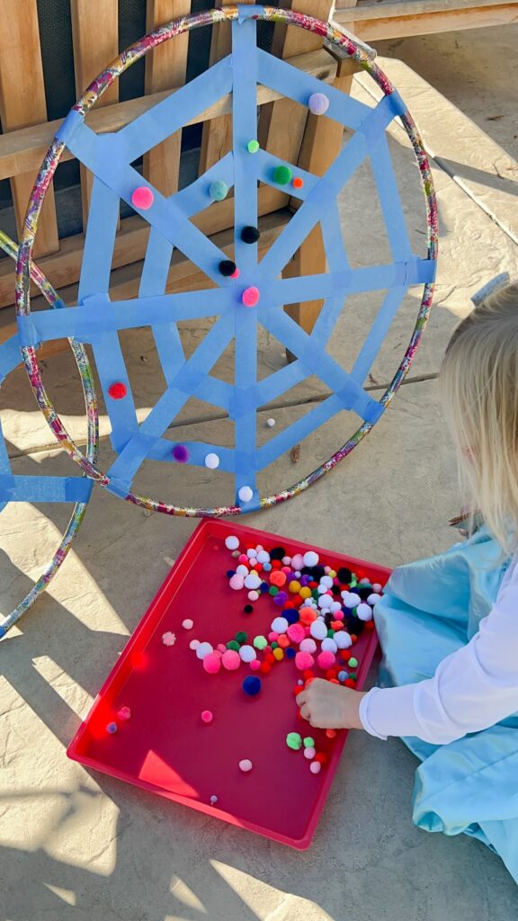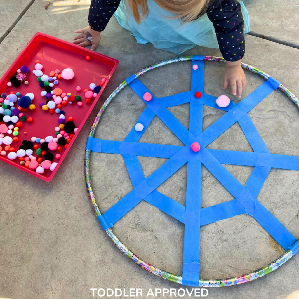 Grab some tape and a hula hoop to set up this easy spider web fine motor activity using pom poms! My friend Allie at No Time for Flashcards shared this spider web activity with me last year and my preschoolers loved it!! You need to try it.