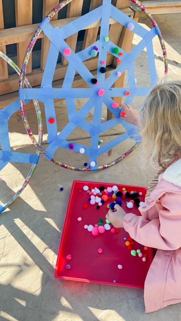 - Encourage kids to stick the pom poms to the spider web to create patterns and lines. See what they can create.