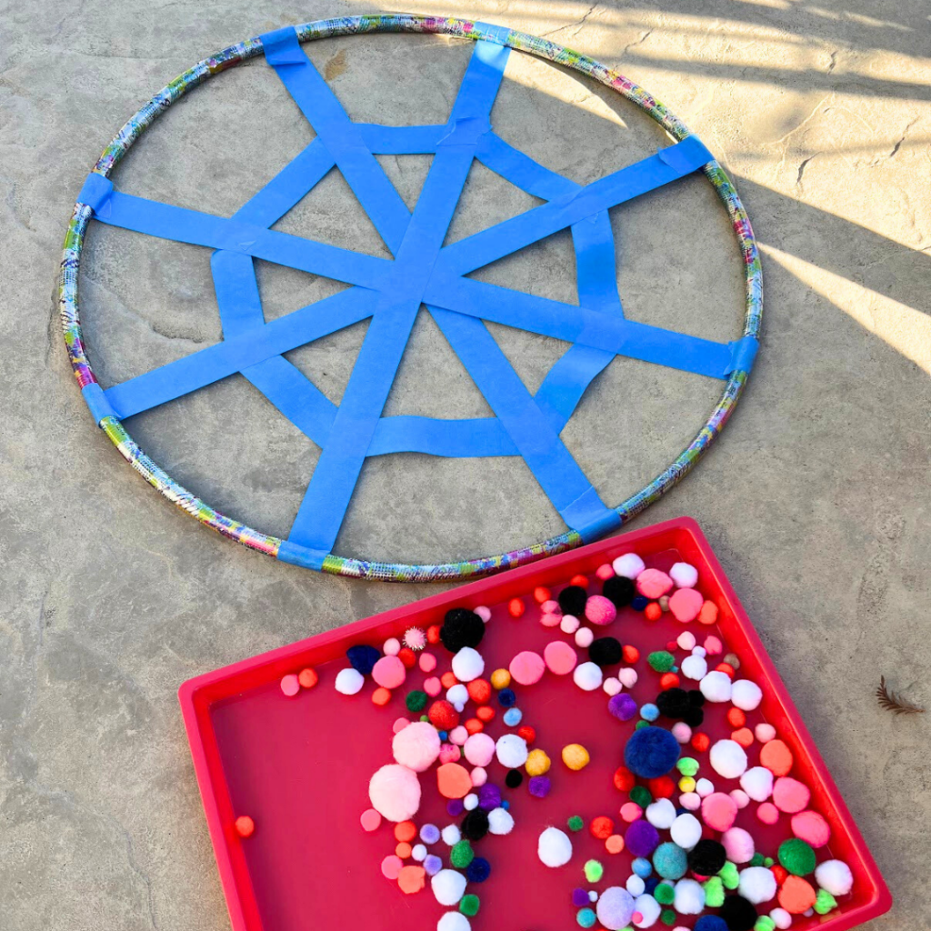 - Place a variety of pom poms on a tray or in a container. Lay the hula hoop spider web on the ground (or place it against a wall), sticky side out.