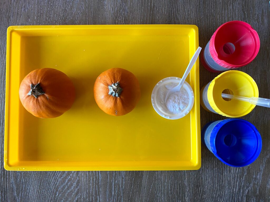 - Language skills as they talk about the colors they see and as they observe the pumpkins fizz.