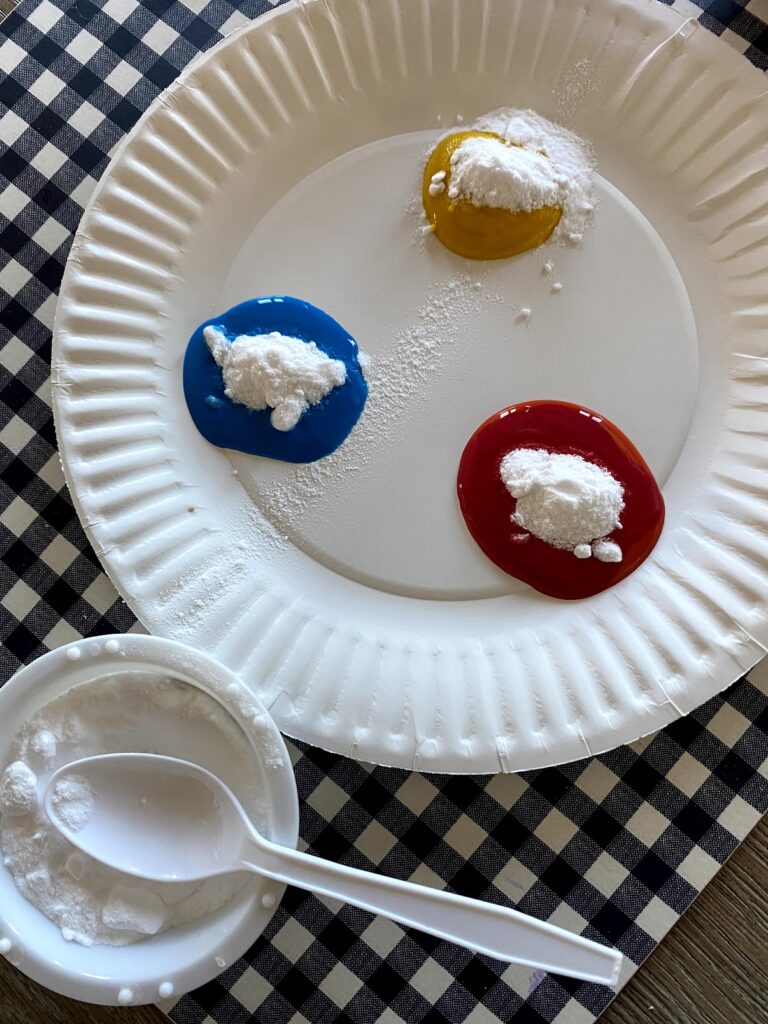 1. Mix washable paint with a 1-2 tablespoons of baking soda. Mix together till you get the desired consistency. Repeat for each color of paint that you want to use.