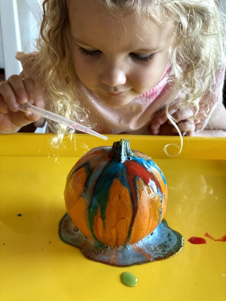 - Observational skills as they watch the pumpkins fizz and they experiment with the paint.