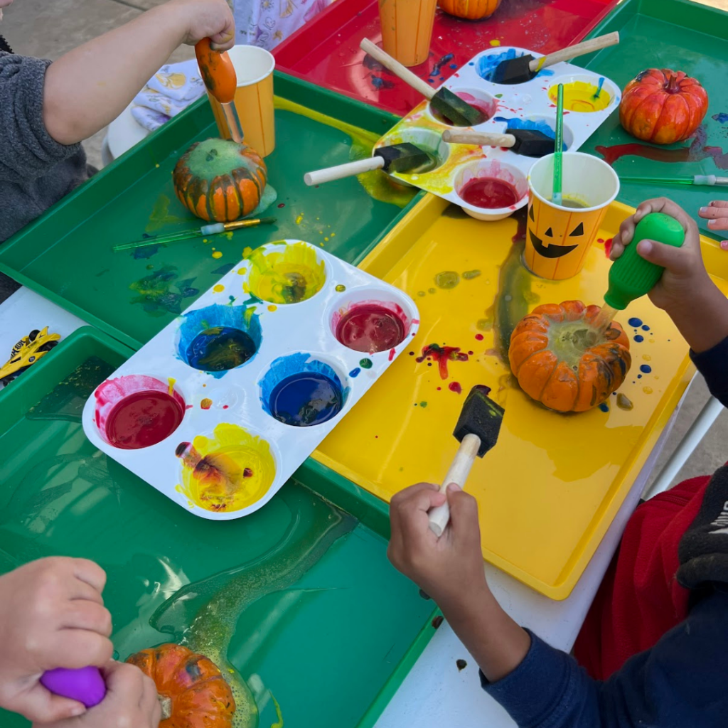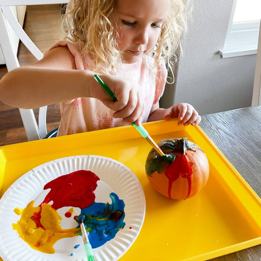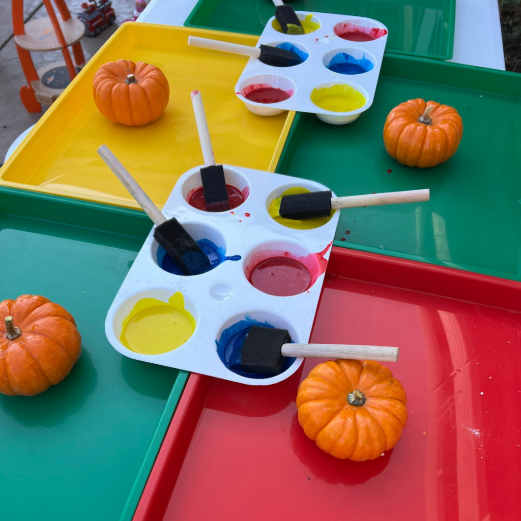 3. Give kids pumpkins, paint, and paint brushes and encourage them to start painting!