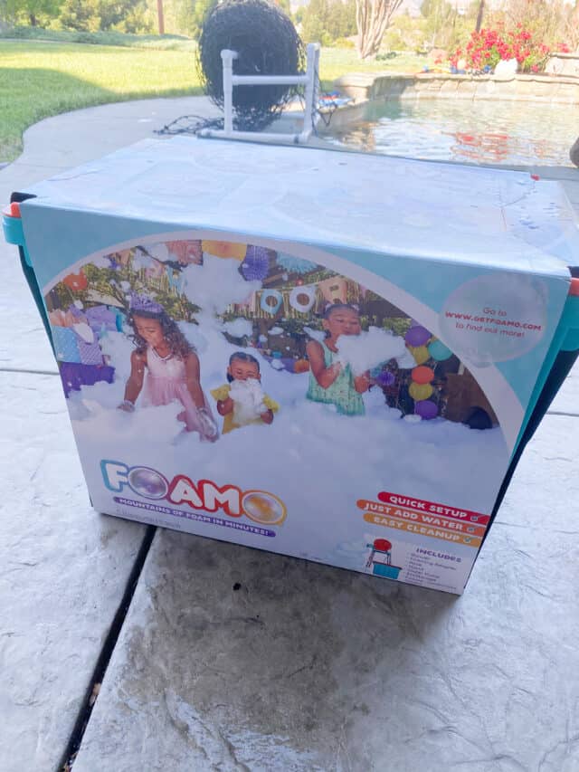 - Foam machine- The easiest way to make a sensory bin filled with foam is using the FoamO foam machine. It makes foam in seconds and fills up entire kiddie pools without hardly any work! This is perfect for if you are hosting friends and want a giant amount of foam. All you do is fill up the machine with foamO solution and water (or tearfree bubble bath and water) and turn on the machine!