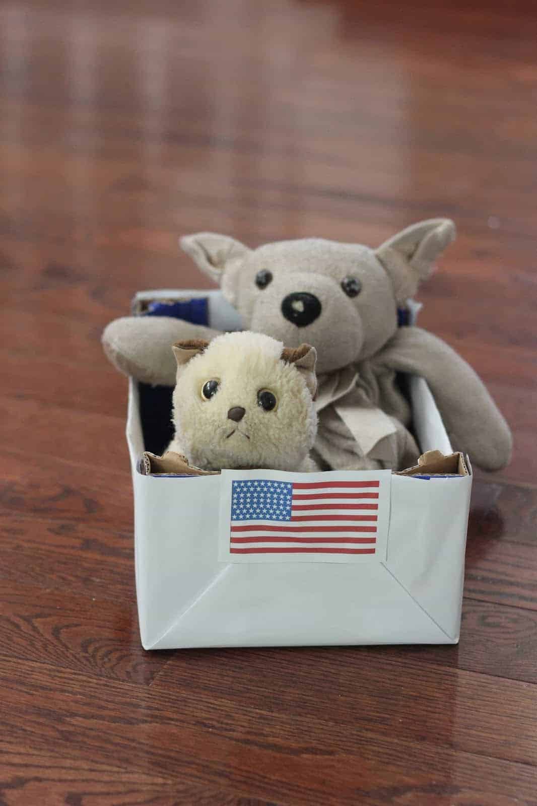 All you need for this activity is a cardboard box, stuffed animals, and some white paper/tape to wrap the box up (if you want).
