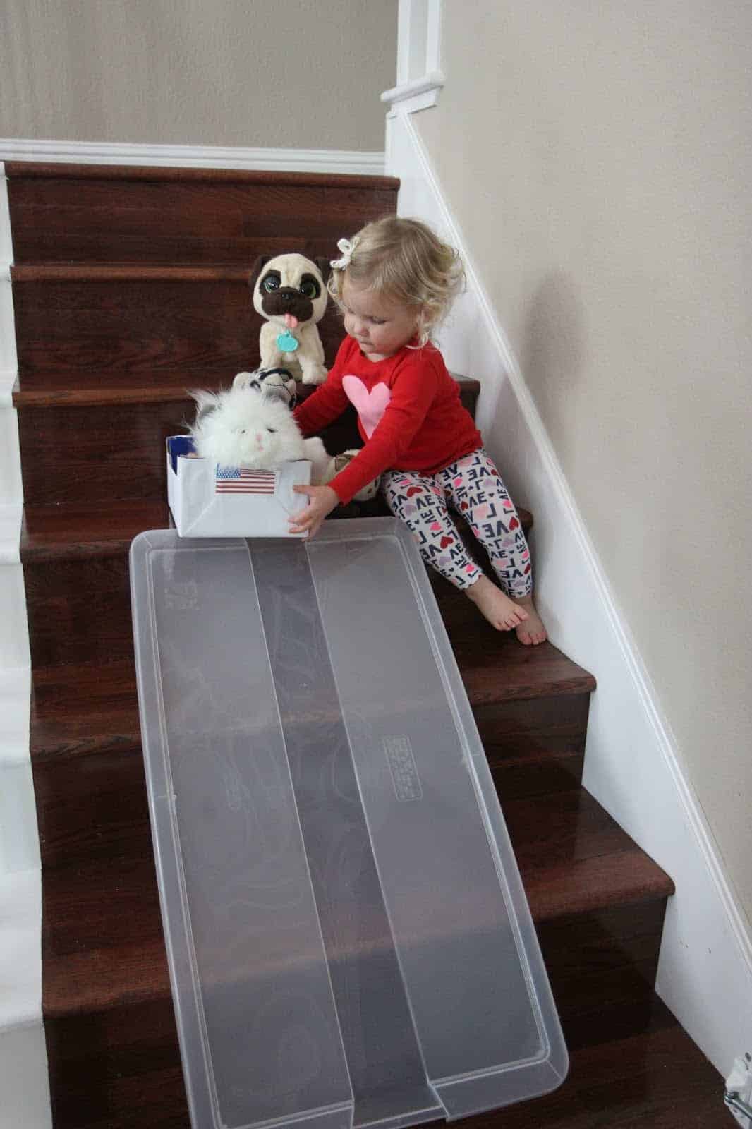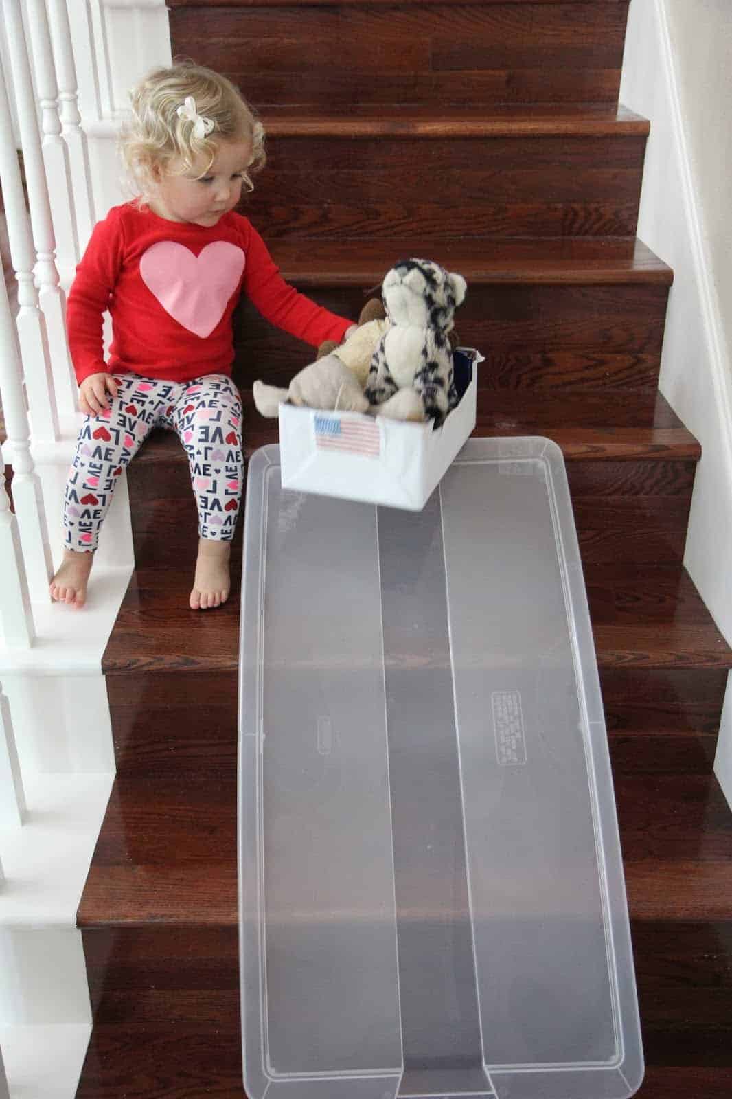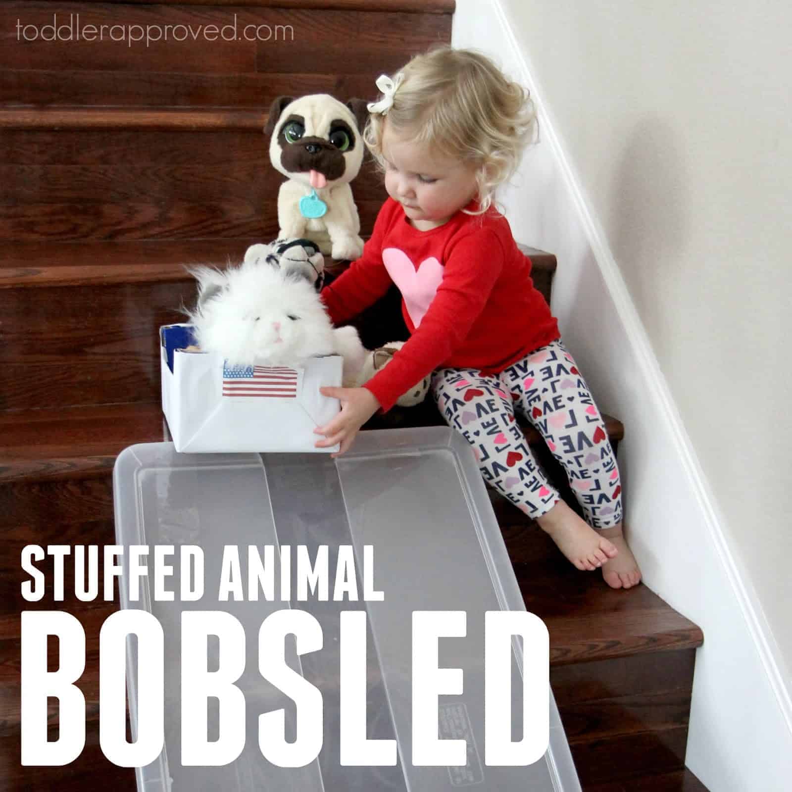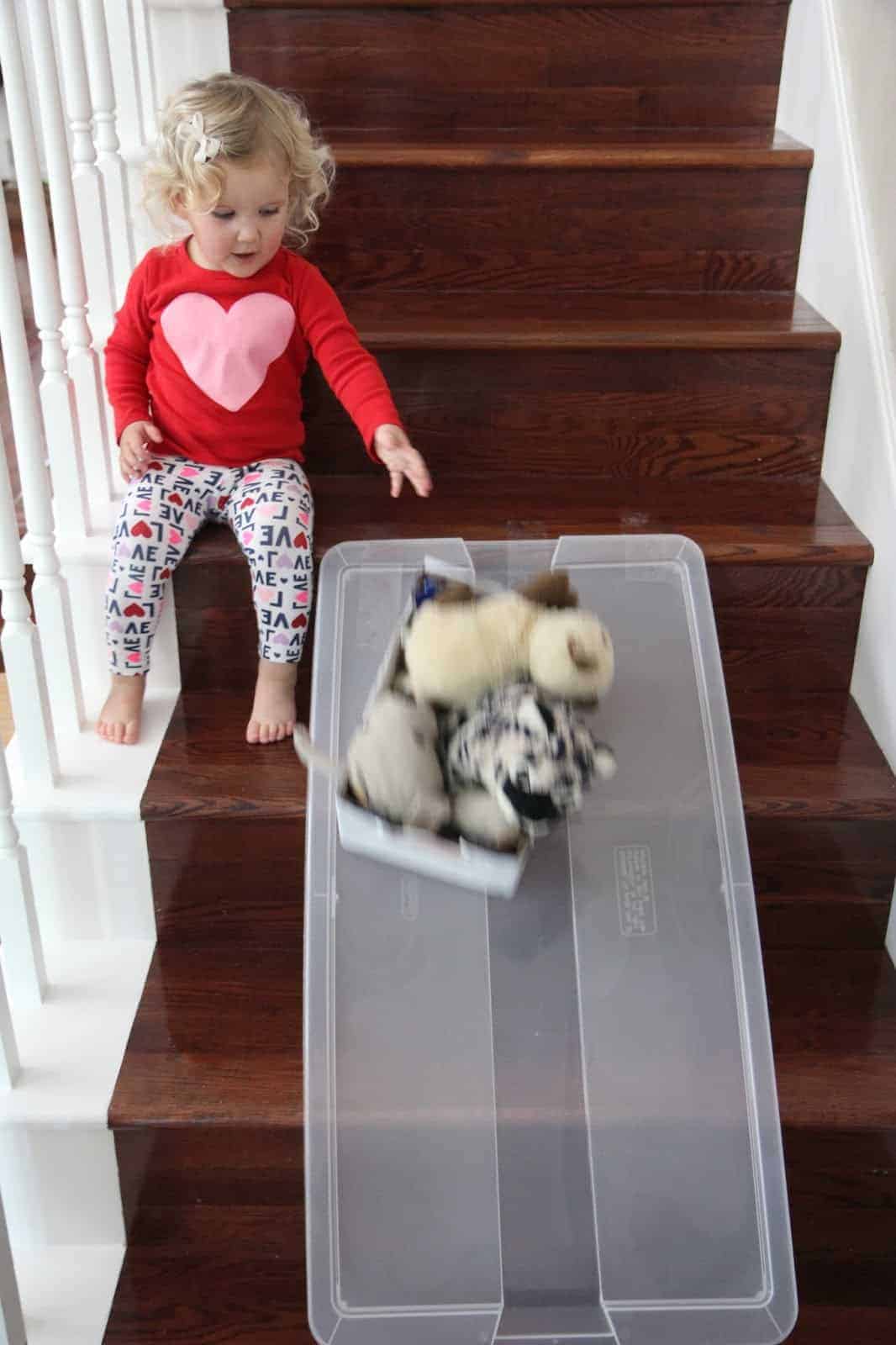 If the stair ramp isn't for you, your toddler can just push the bobsled box with animals in it all around the house. If you have a bigger box, kids could just push each other in their big bobsleds all around the house.