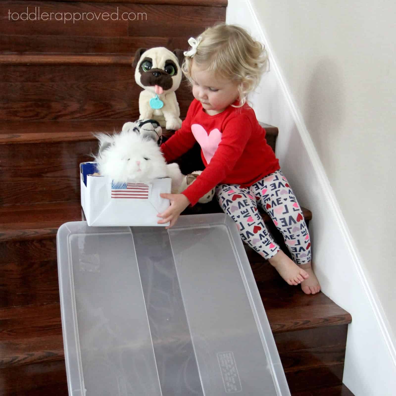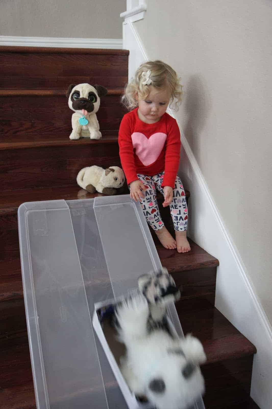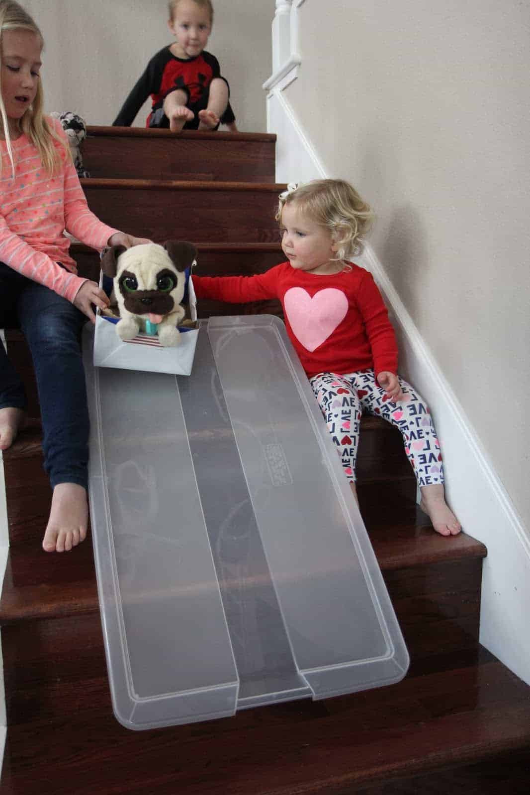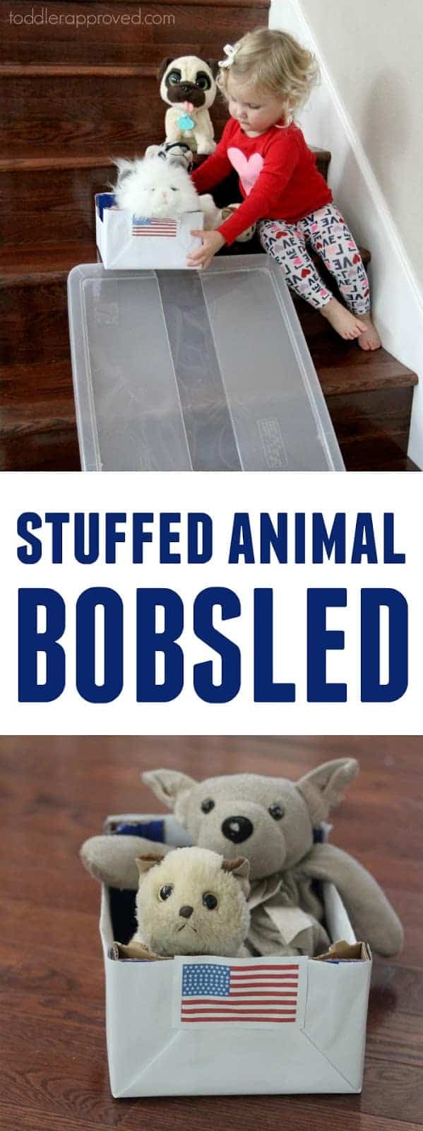 If the stair ramp isn't for you, your toddler can just push the bobsled box with animals in it all around the house. If you have a bigger box, kids could just push each other in their big bobsleds all around the house.