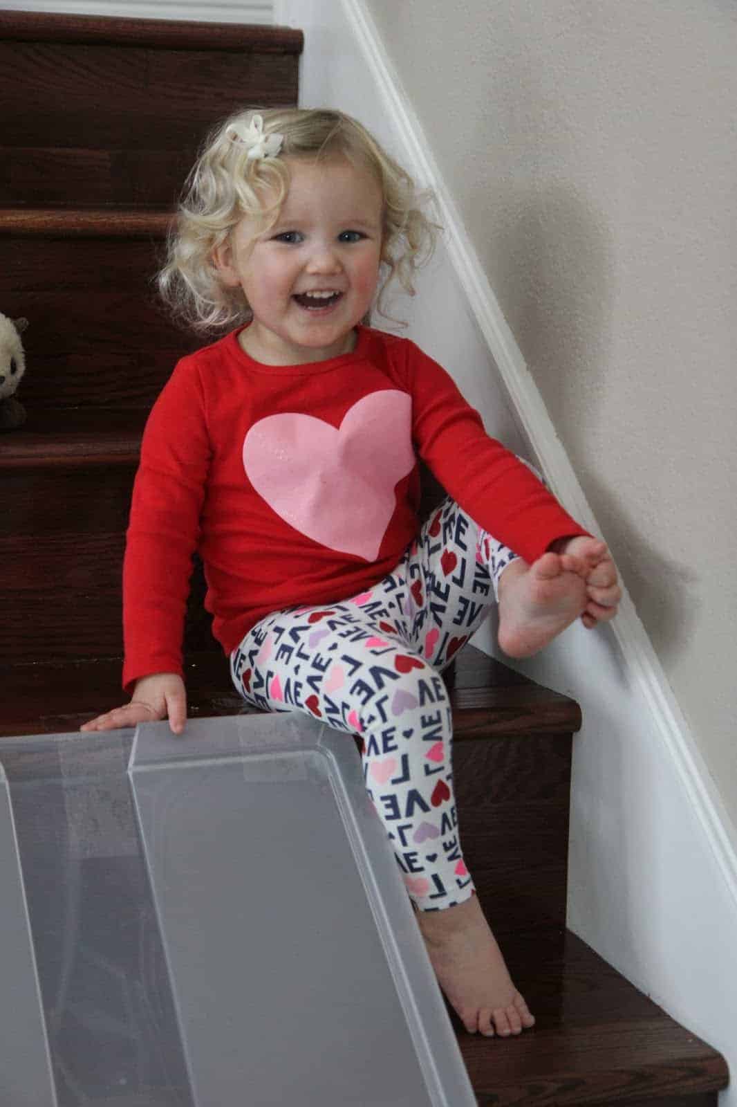 Toddlers on stairs can be a little scary. Make sure your little one sits down next to the ramp (not above the ramp), so that when she launches her bobsled she doesn't tumble down the stairs afterwards.