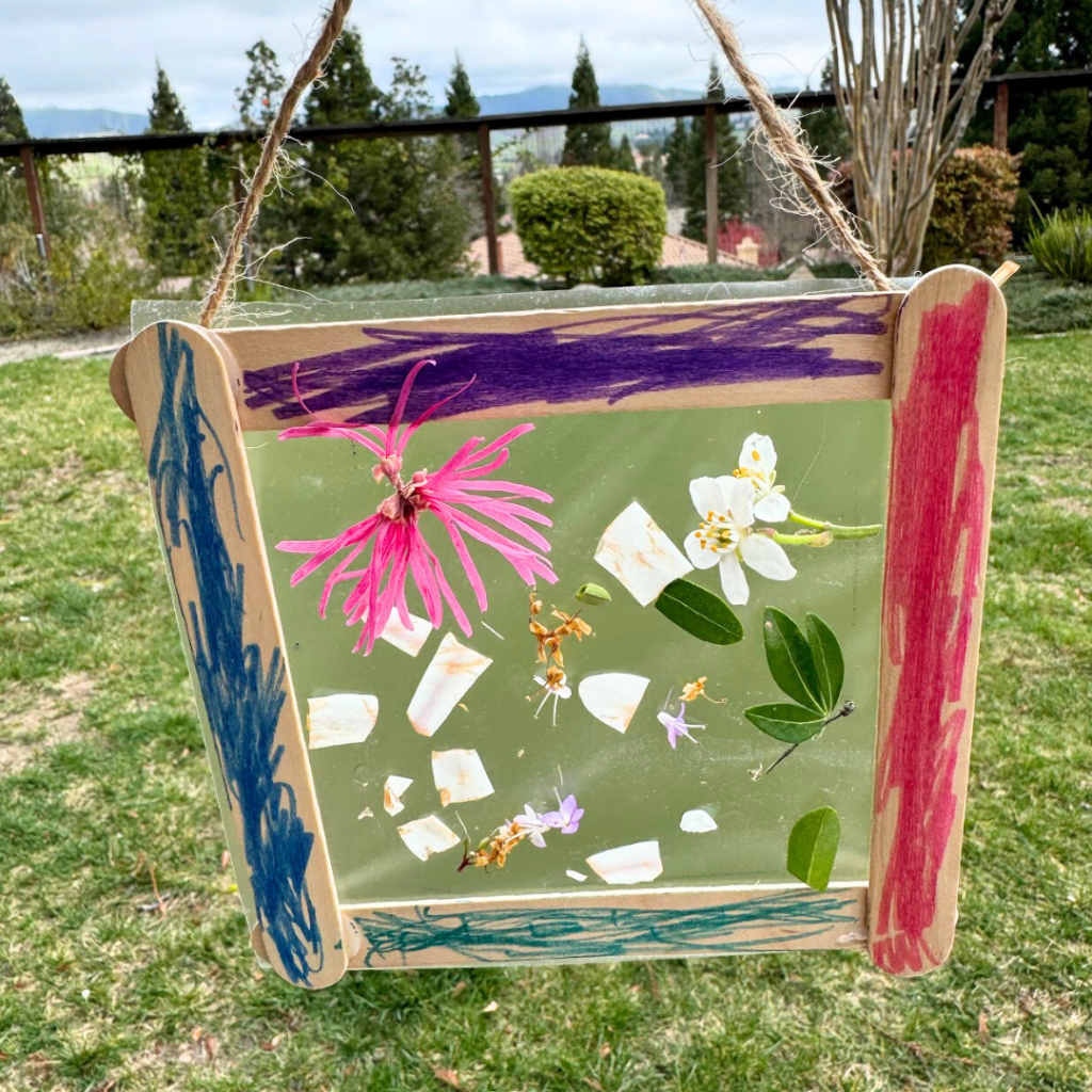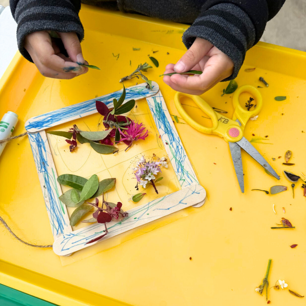 - Encourage kids to snip and rip from the nature trimmings you give them and stick them onto the center of their sticky frame.