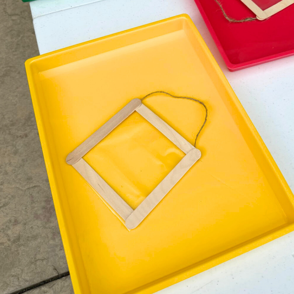 - Glue craft sticks together to make a square frame (use hot glue or white glue to secure the sticks together)