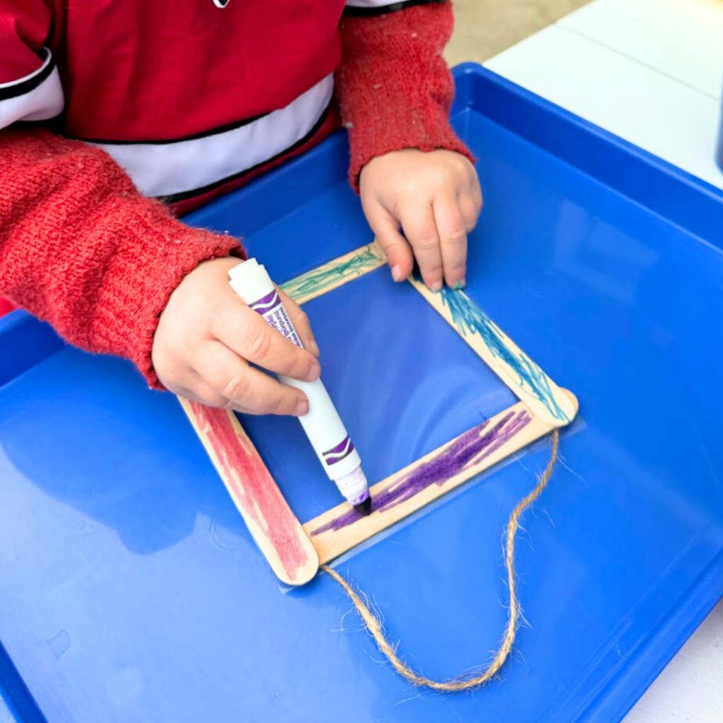 - Have kids decorate the craft stick frame with markers.