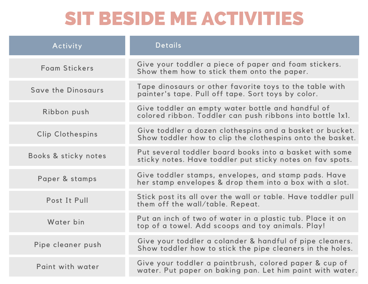 Inside this post I'm sharing 25+ pretty simple to set up "sit beside me" activities that you can use when you need to get your toddler out of your hair for a few minutes so you can get some work done.