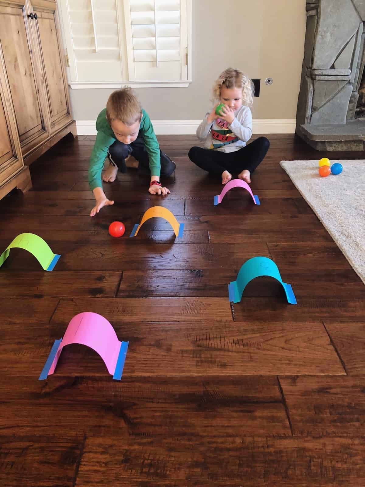 It only takes a few minutes to tape paper tunnels to the floor and then you are ready to start rolling! These are also fun to use with cars and trains.
