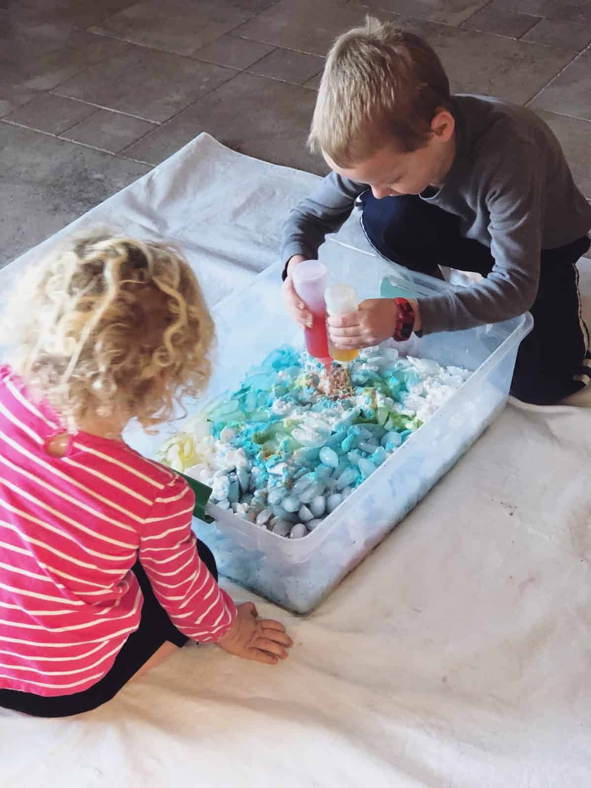 Baking soda + colored vinegar + ice! This activity can last all afternoon.Â