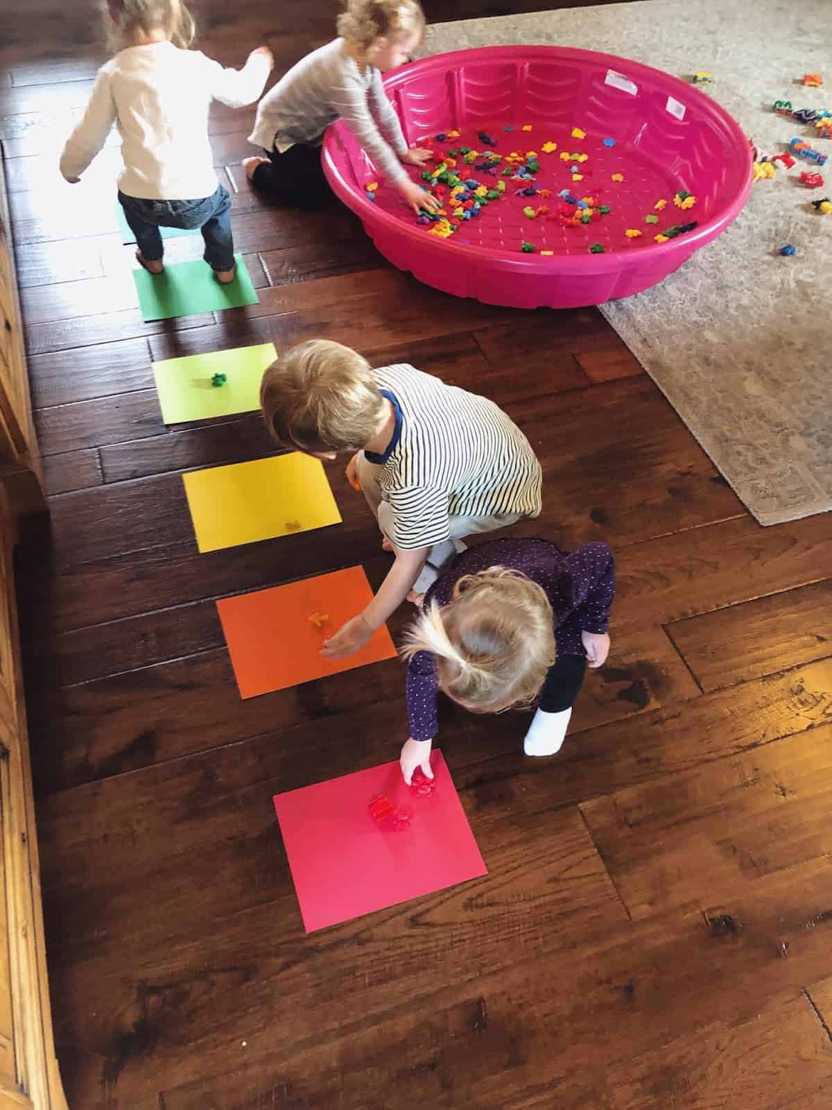 You can do this with any toys around your house, including your Lego duplo bricks. Tape some colored paper to the floor and you are ready to sort.
