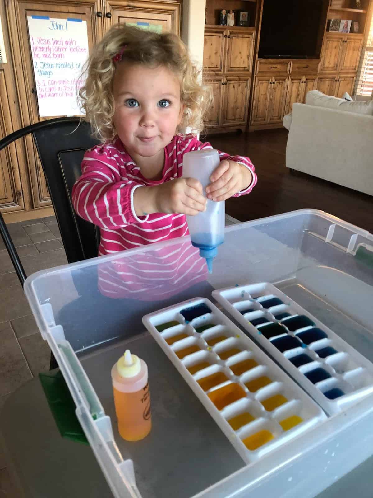 Grab some ice trays and scoops or squeeze bottles filled with colored water. Squeeze the colored water into the ice trays and mix and play! It is so fun to see the different colors kids make.