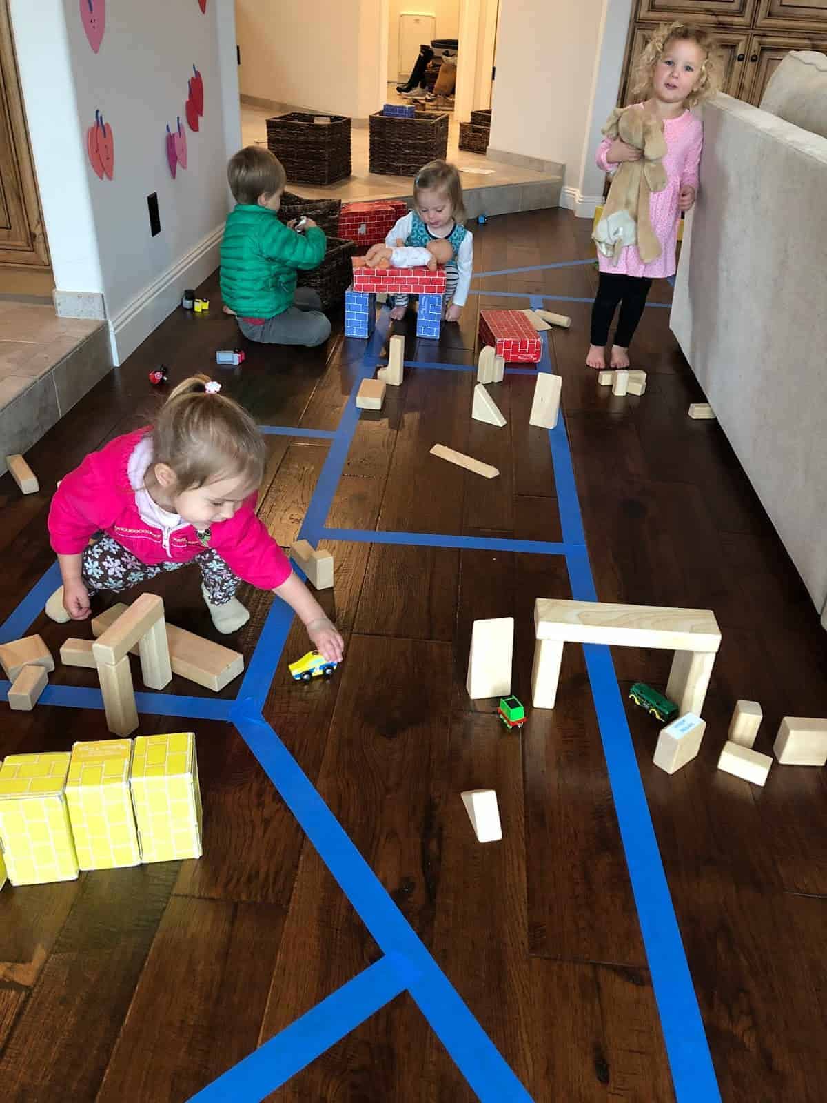 Make a car track using painter's tape. Pull out your Lego Duplo or wood blocks to make houses and create your own town.